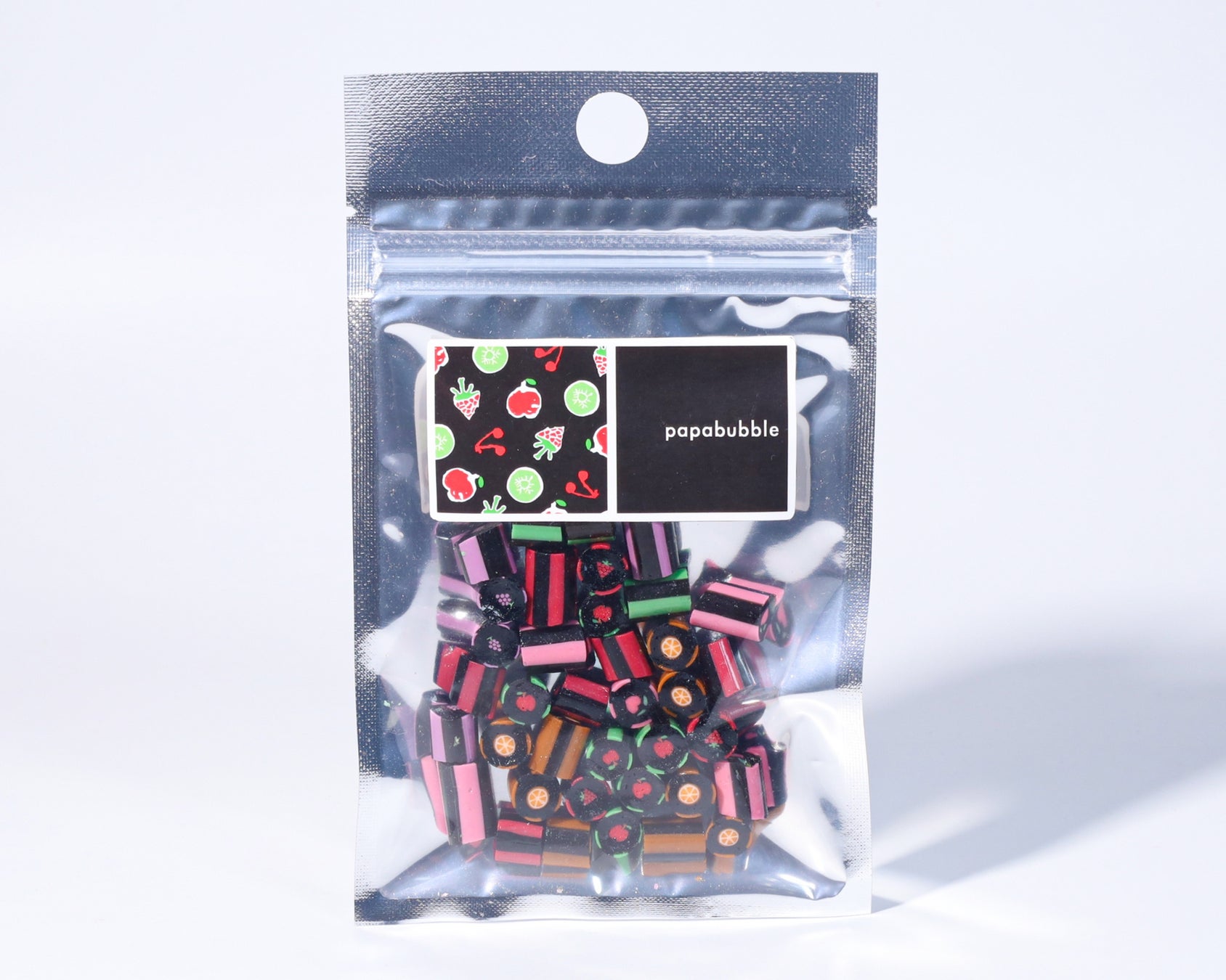 パパブブレ一番の人気商品である「フルーツミックス」の絵柄を、ブラックフライデーにちなんで”ブラック”に染めました。フレーバーは全て「フルーツ」×「ソーダ」のため、お子様にもおすすめのラインナップになっています。いつもと少し違う真っ黒なキャンディをお楽しみください。価格はそのままで、50gの量が入っているお得なキャンディです。