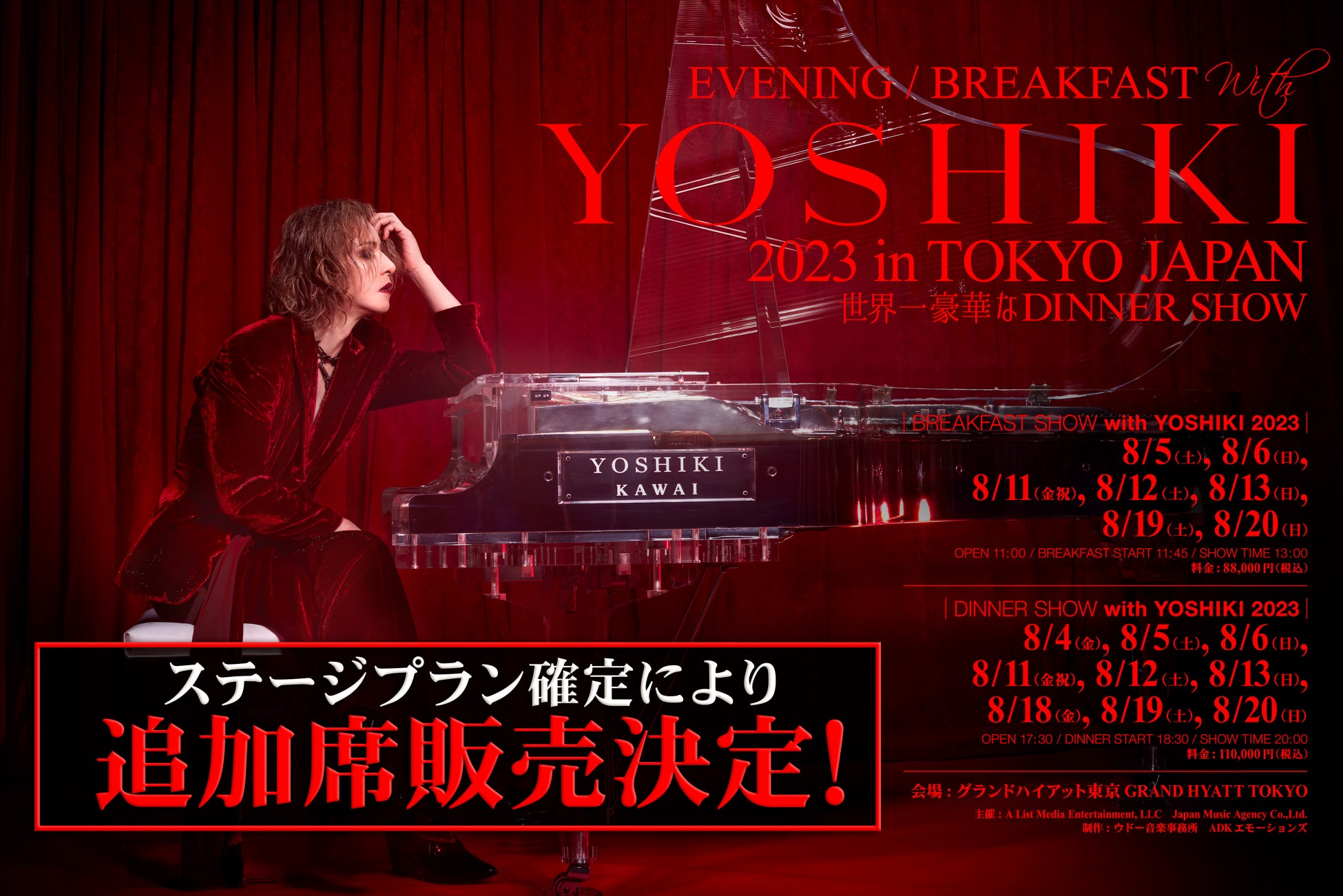 2023年8月4日(金)より始まる「EVENING / BREAKFAST with YOSHIKI 2023 in TOKYO JAPAN 世界一豪華なDINNER SHOW」のチケットが、ステージプラン確定により5月17日(水)15時から一般先着(国内&海外)にて追加販売されることが決定した。