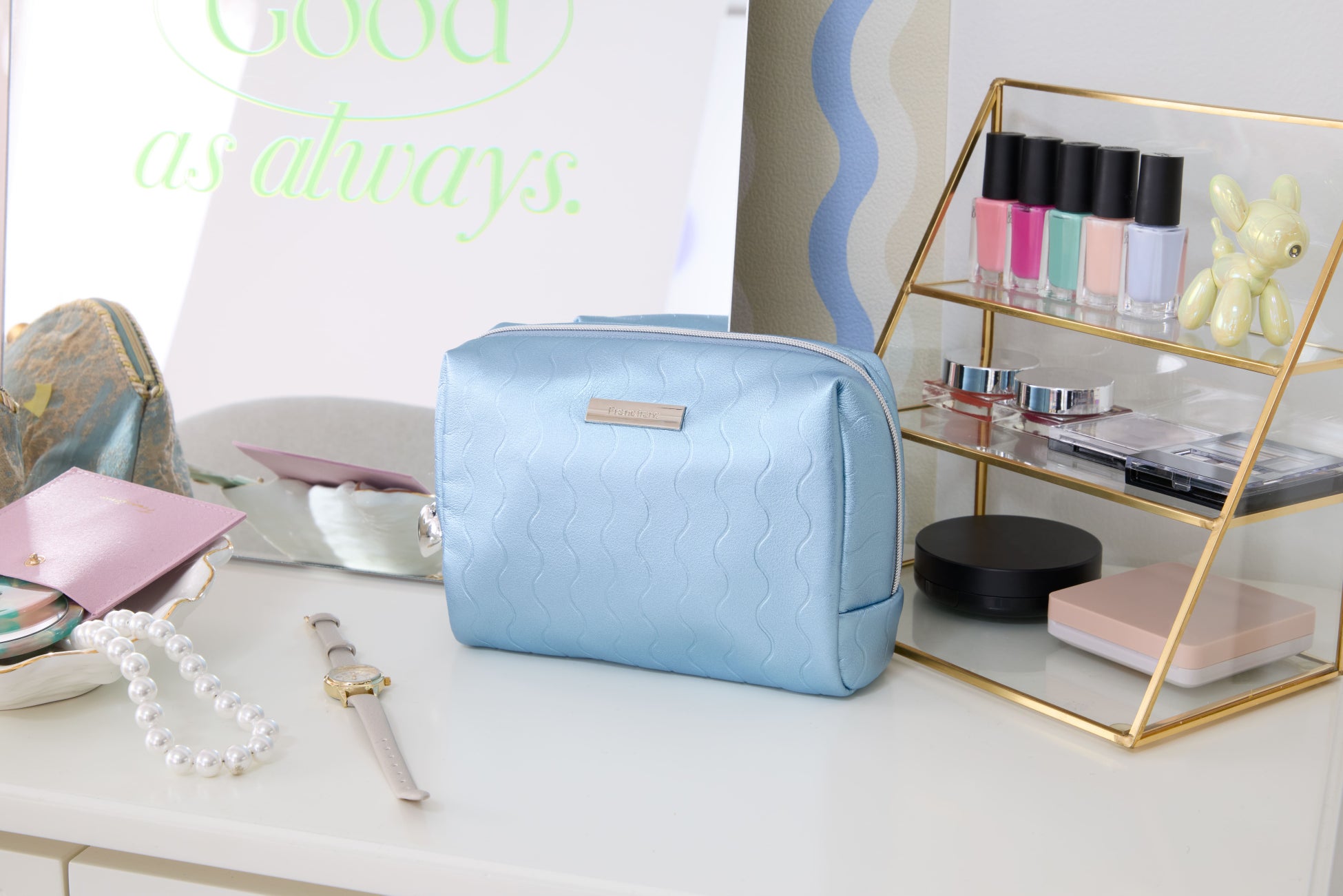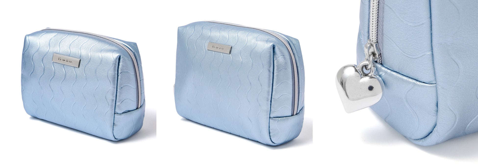未来的なメタリックブルーの生地に、ウェーブ模様を型押しした個性的なデザインのポーチです。ジッパーの引き手はコロンとしたシルバーのハートでかわいらしさもプラスしています。