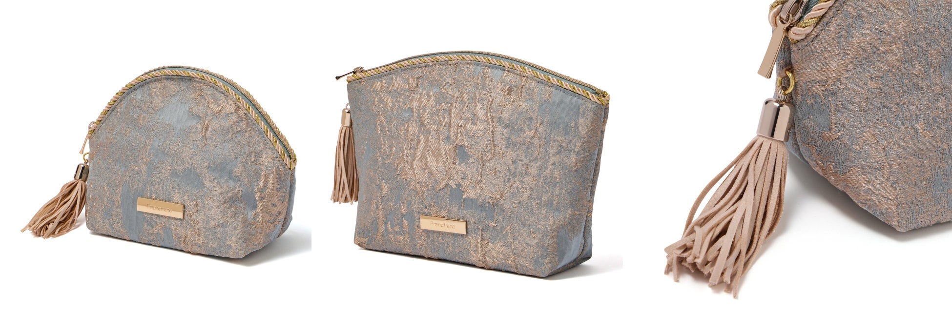 絵画のようなゴールドのテクスチャーが美しい生地を使用した、エレガントなデザインのポーチです。装飾ロープやタッセルなど細部まで豪華な仕上がりがポイントです。
