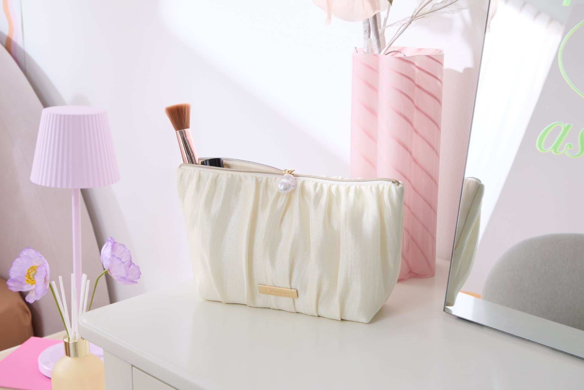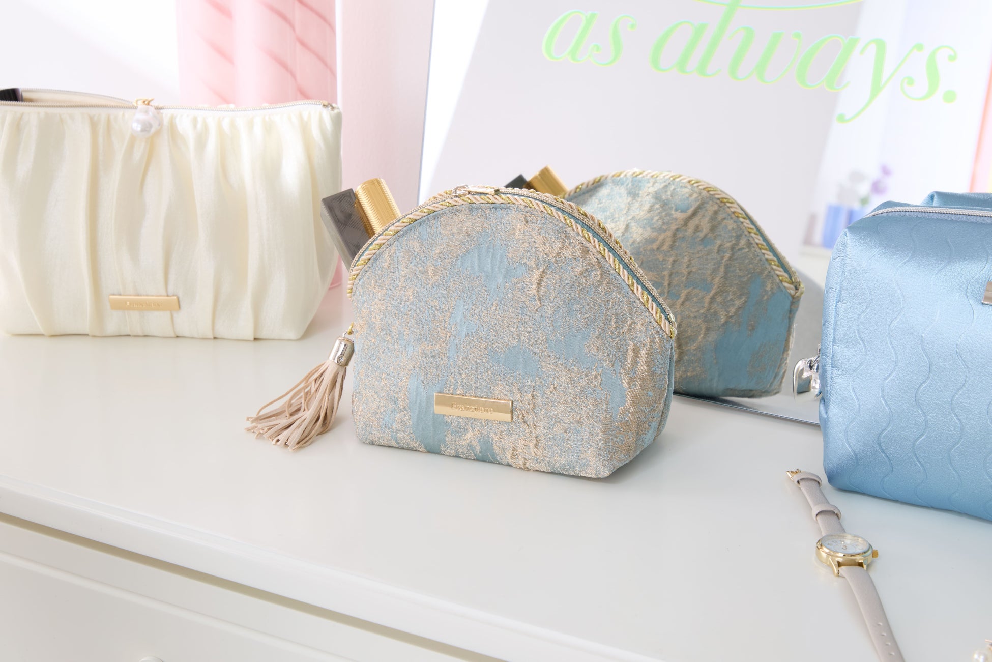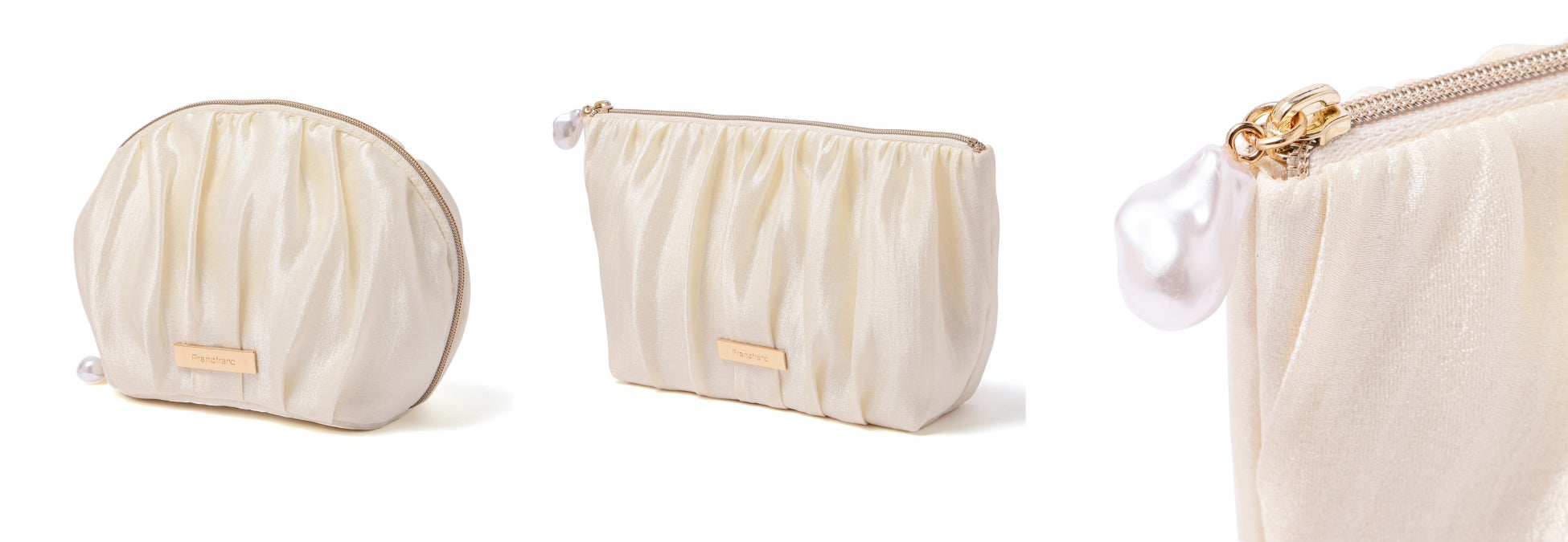 パールのような光沢シフォン生地を使った、フェミニンで上品なデザインのポーチです。ジッパー引き手には淡水パール風のモチーフがついており、細部までこだわったデザインです。