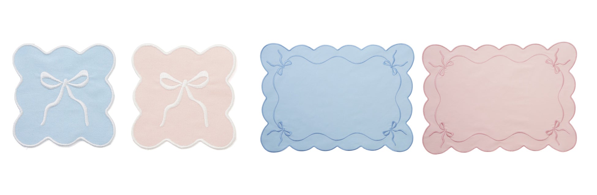 リボンの刺繍が施されたスカラップ形状のコースターとランチマットです。生地と刺繍が同系色なので可愛くなりすぎず、華やかなテーブルコーディネートを演出できます。「リボン」シリーズと組み合わせてトレンドのコーディネートが楽しめます。