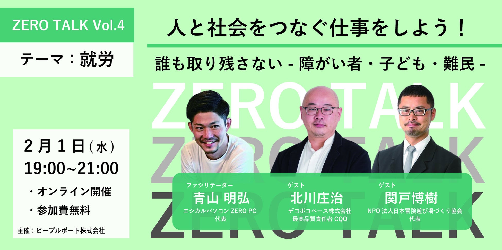 環境負荷ゼロと難民ゼロを目指し、再生パソコン「ZERO PC」の製造販売を行うピープルポート株式会社*(所在:神奈川県横浜市、代表取締役社長:青山明弘)は、デコボコベース株式会社(所在:東京都港区、代表取締役CEO:上岳史)及び、特定非営利活動法人日本冒険遊び場づくり協会(所在:東京都豊島区、代表:関戸博樹)と協働し、2023年2月1日(水)19時から、無料の3社合同オンライントークイベント【ZEROトーク】を開催いたします。