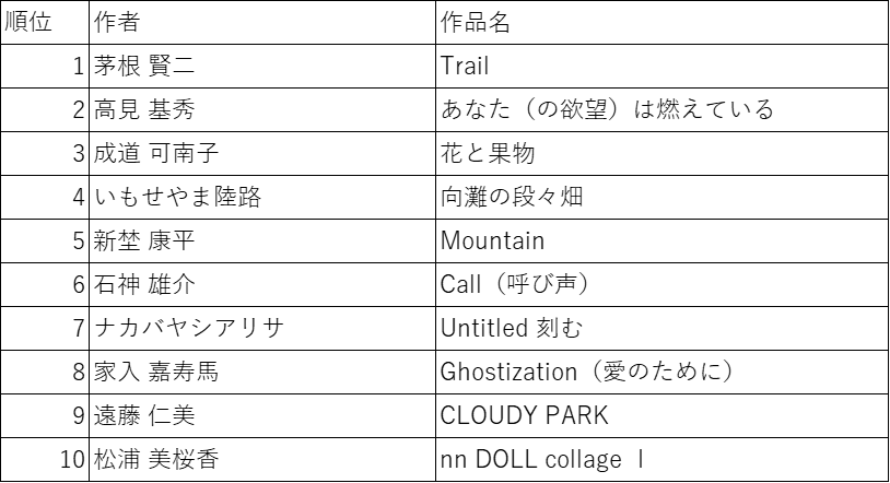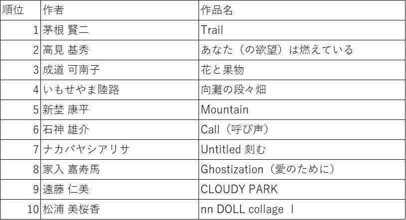 ■Idemitsu Art Award展 2022「オーディエンス賞」投票結果(10位まで) 総投票数:2,755