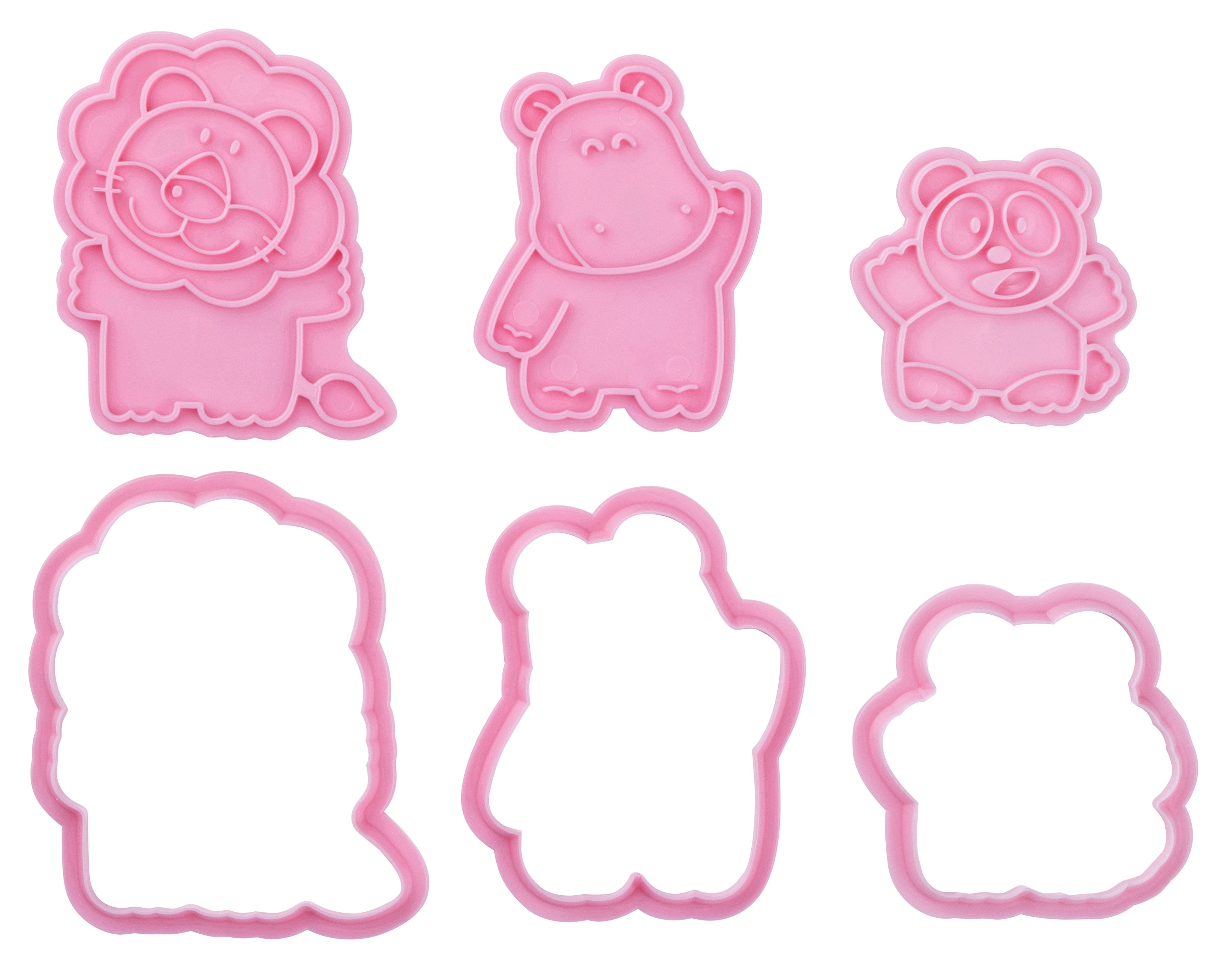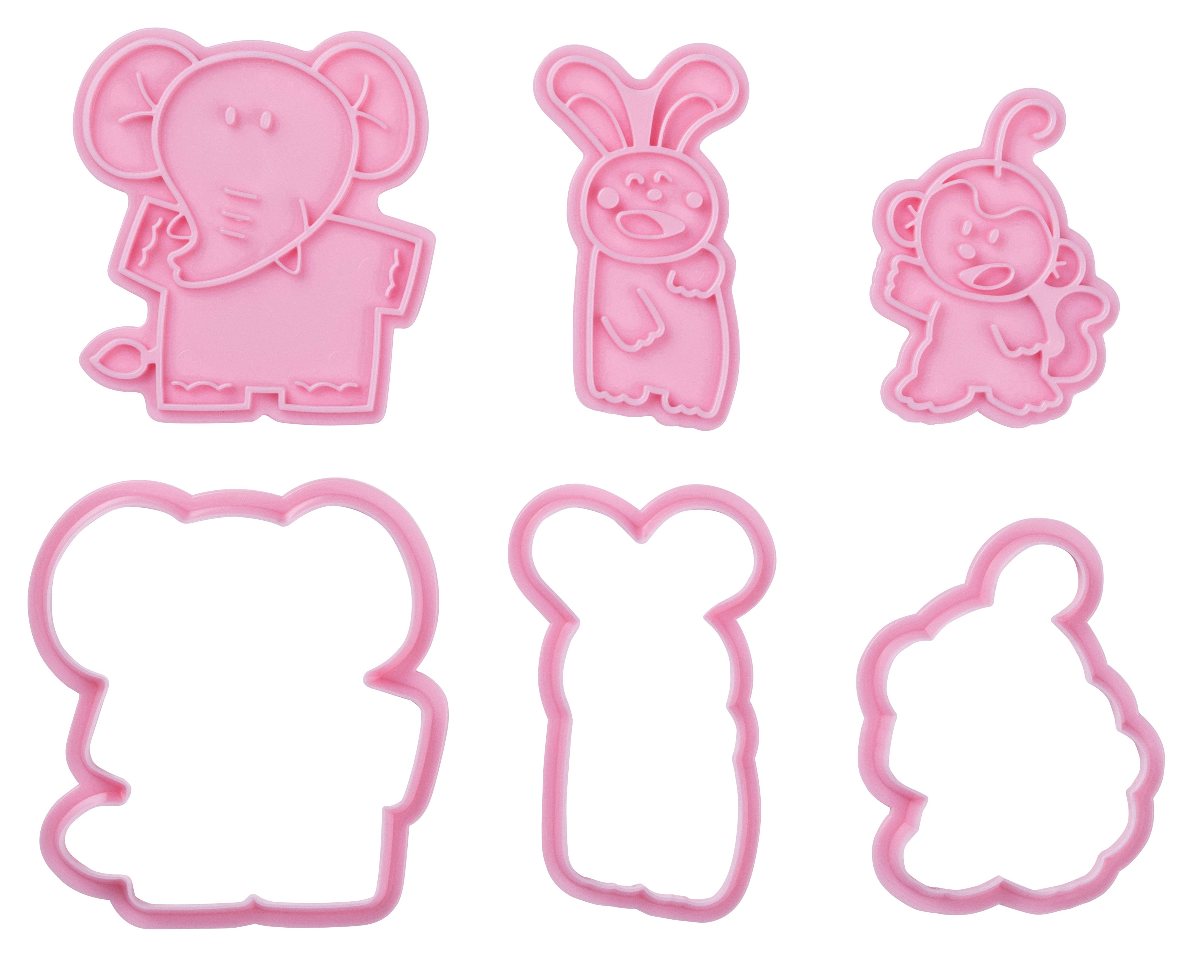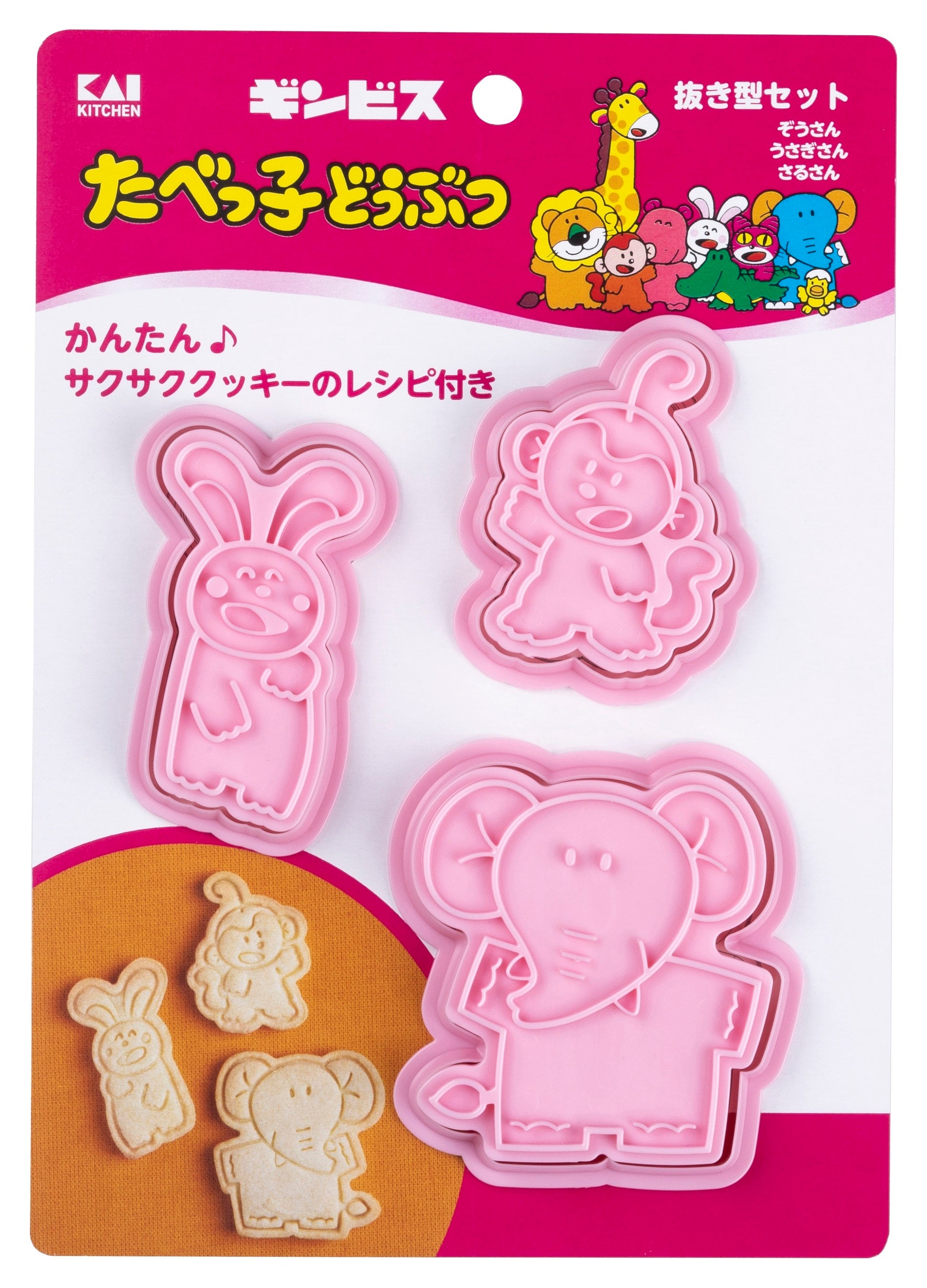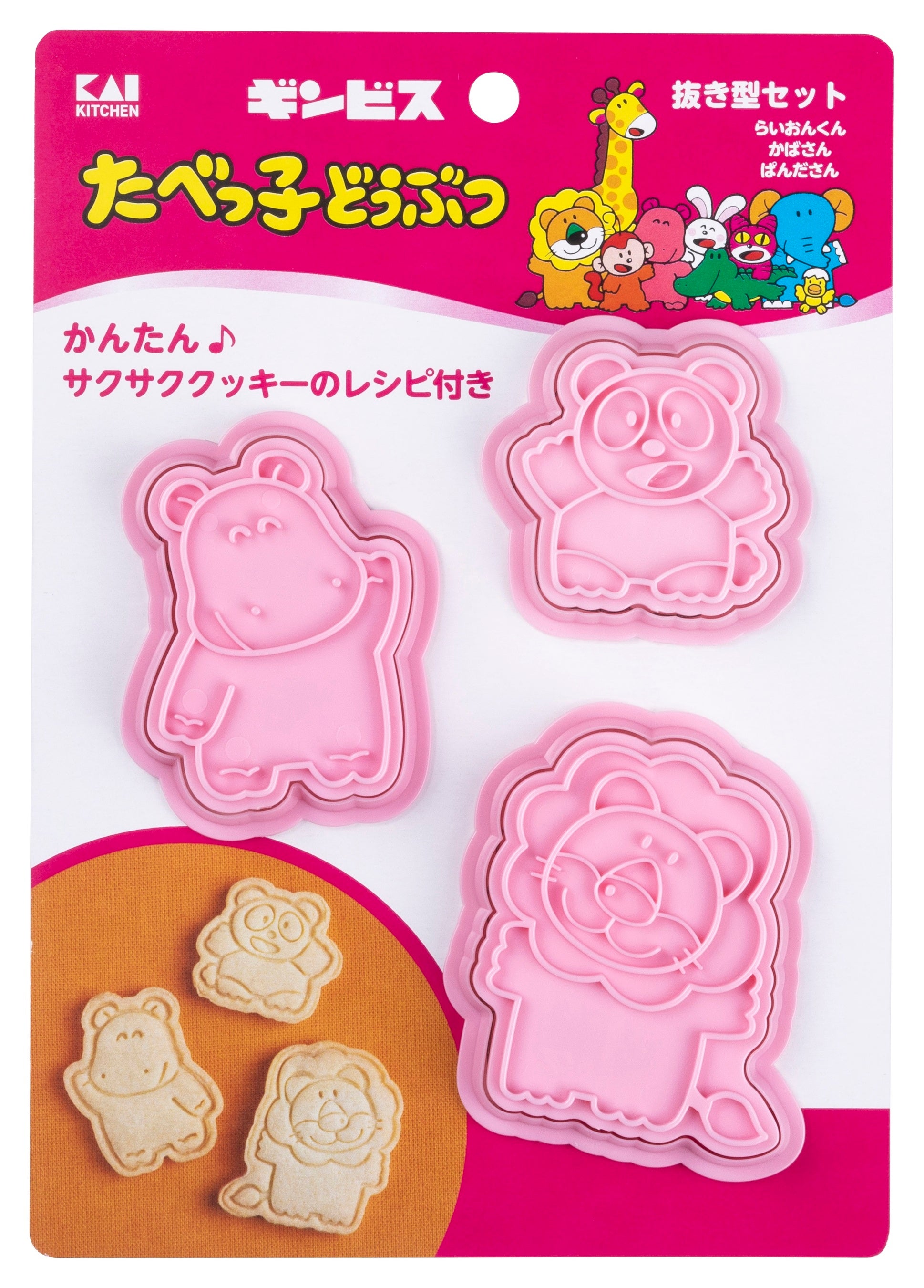 たべっ子どうぶつのキャラクターのクッキーを作れる、抜き型とスタンプ型のセットです。細かい表情をスタンプで簡単に表現することができます。らいおんくん・かばさん・ぱんださん、ぞうさん・うさぎさん・さるさんの2つの組み合わせで展開。