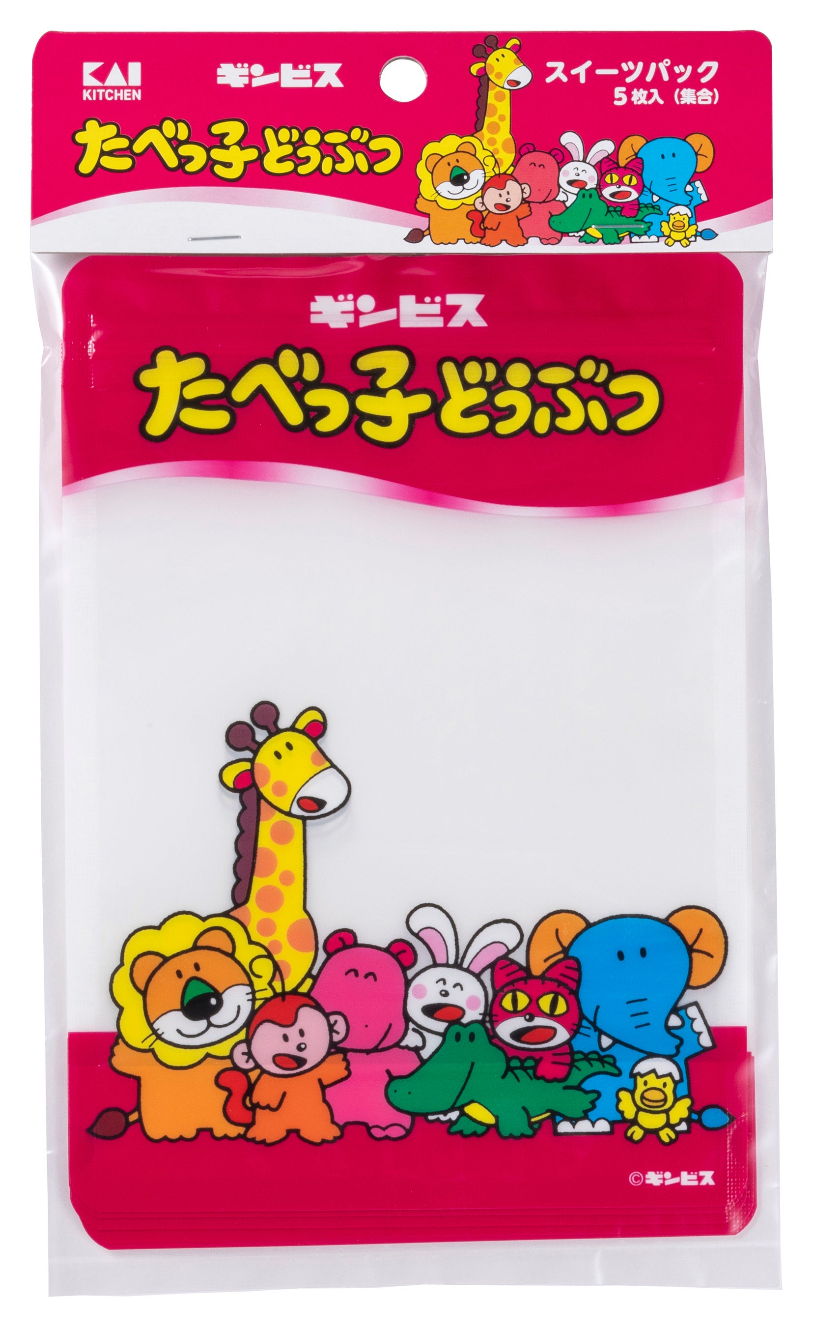 クッキーやチョコレートを入れて、プレゼントでも活躍するラッピング袋です。中に入れたお菓子が透けて見えるデザインで、ビスケット柄と、キャラクターが集合したイラストの2種類を展開。5枚入りで、保管に便利なジッパータイプです。
