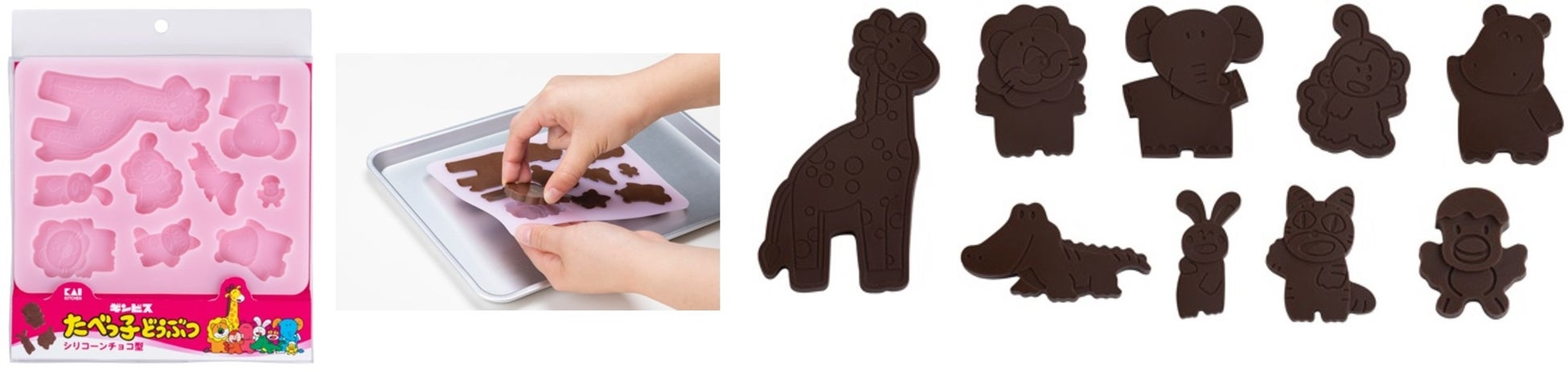 たべっ子どうぶつの9種類のキャラクターのチョコレートを一度に作れるシリコーン型です。チョコレート以外にも、グミや氷作りにも使えます。