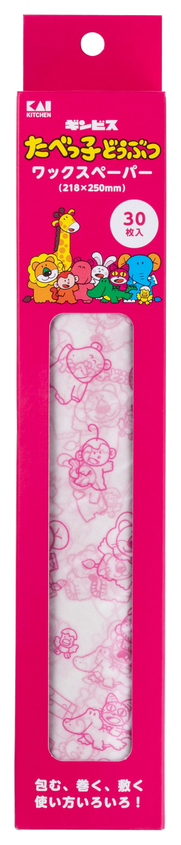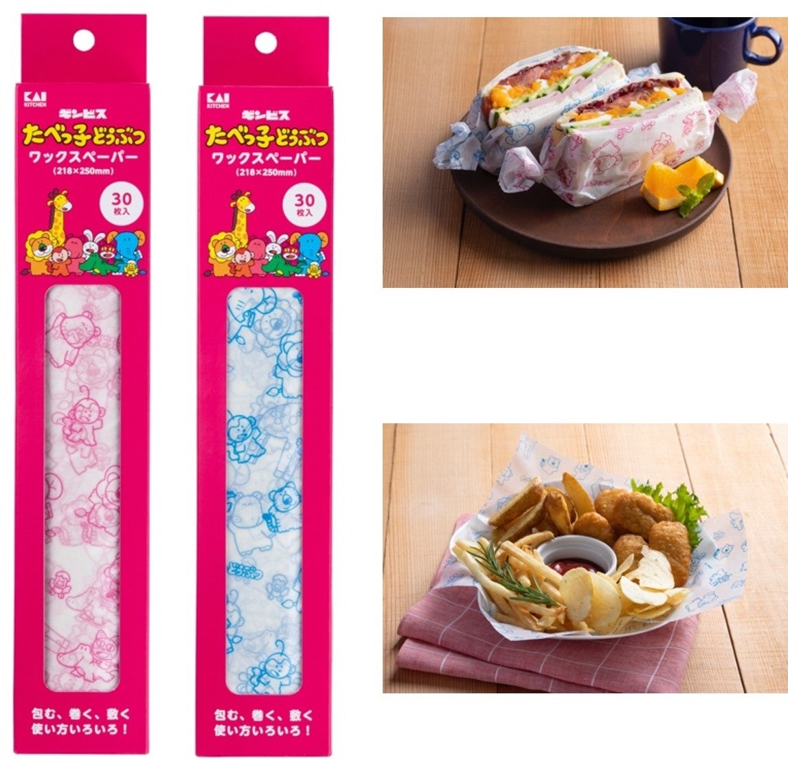 耐油性の紙にたべっ子どうぶつのデザインがプリントされたワックスペーパーです。巻く、包む、敷く、仕切りにするなど、お菓子をラッピングする以外にも、幅広い使い方が可能です。30枚入りで、取り出しやすく保管にも便利なボックス入り。シンプルで使いやすい、ピンクとブルーの2色展開です。