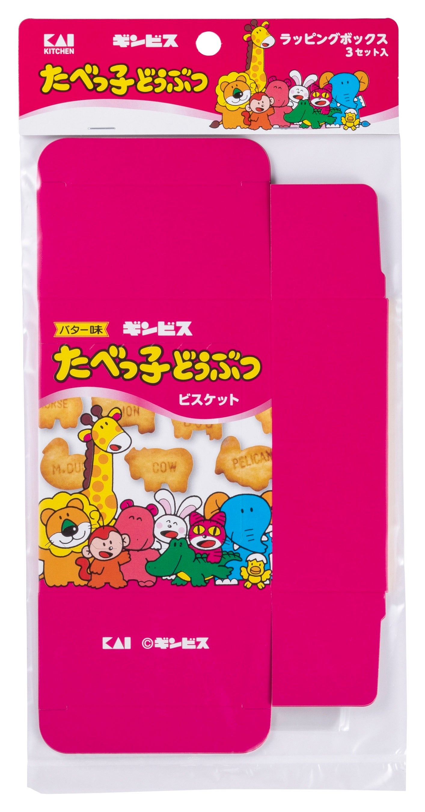 たべっ子どうぶつビスケットのパッケージのようなデザインのラッピングボックスです。箱とOPP袋が3セット入っています。クッキーが約3枚程度入るサイズ感で、かわいいデザインはプチギフトにぴったりです。