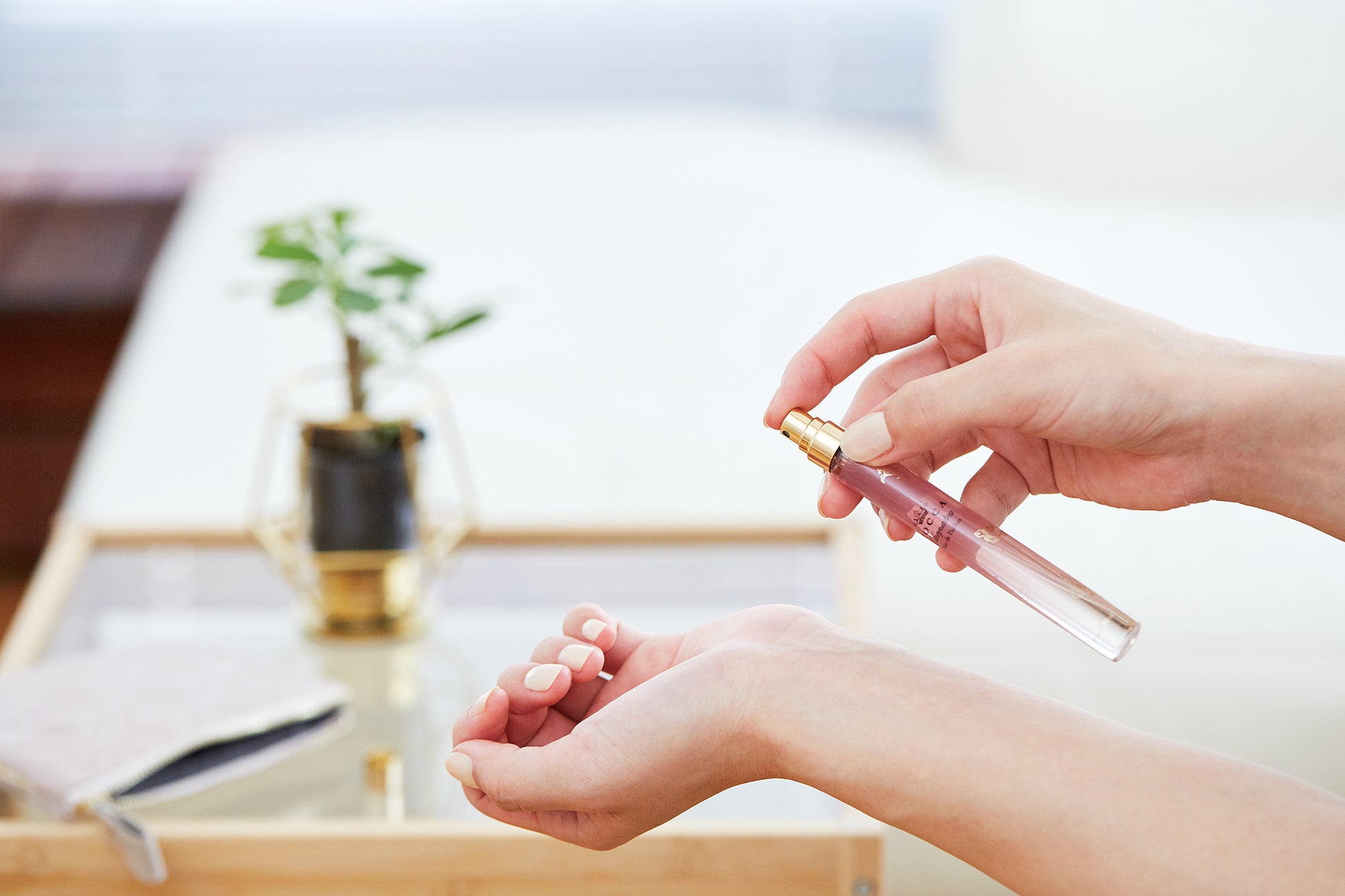 携帯しやすいミニフレグランススプレーで明るいフルーティーフローラルの香りを楽しんで