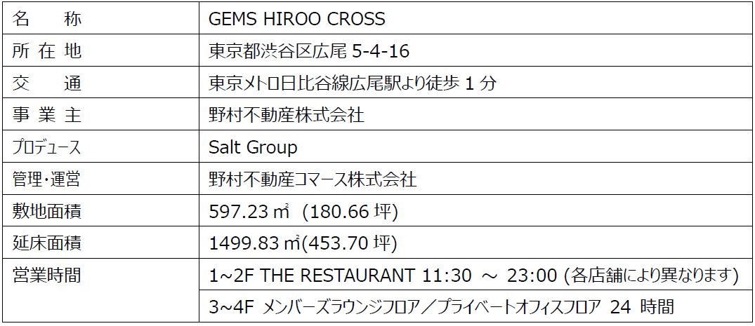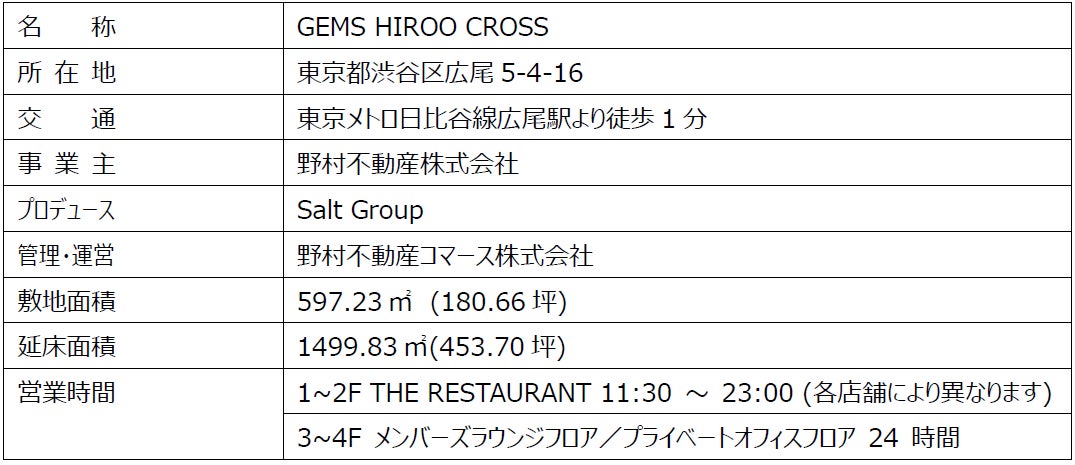 「GEMS HIROO CROSS」は1階から6階の全てのフロアを通して、「食べて」「遊んで」「仕事して」をコンセプトにデザインされております。1階と2階のレストランフロアには国内外で注目を集める名店の新業態17店舗が集結。一流の味をカジュアルに楽しめる新業態を中心にSpeciality Restaurants Hall「THE RESTAURANT」を展開しております。3階~6階にはコワーキングスペースが開業しており、メンバーと、そのゲストのみが利用可能なメンバーズラウンジや、プライベートオフィスを提供しております。ここには仕事をしたり、夜に仲間と飲んだり、瞑想したりと好きな場所で自由に過ごせる、上質で開放的な空間が広がります。