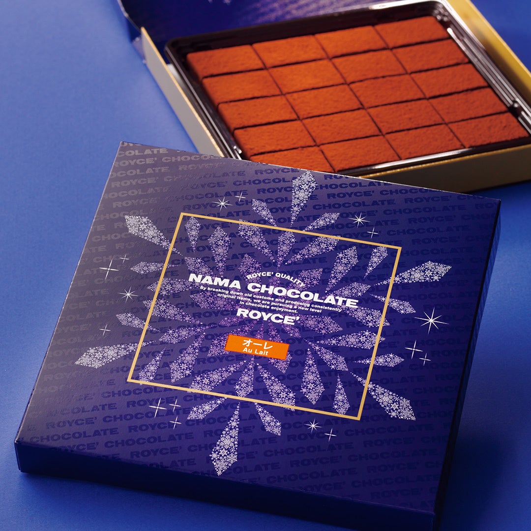 ミルクチョコレートに北海道の生クリームをブレンドし、風味付けに洋酒を加えた、ロイズの生チョコレート人気NO.1の[オーレ]。ミルクとカカオの風味が生きたおいしさを、北海道に舞う美しい雪の結晶を描いたスペシャルパッケージに。