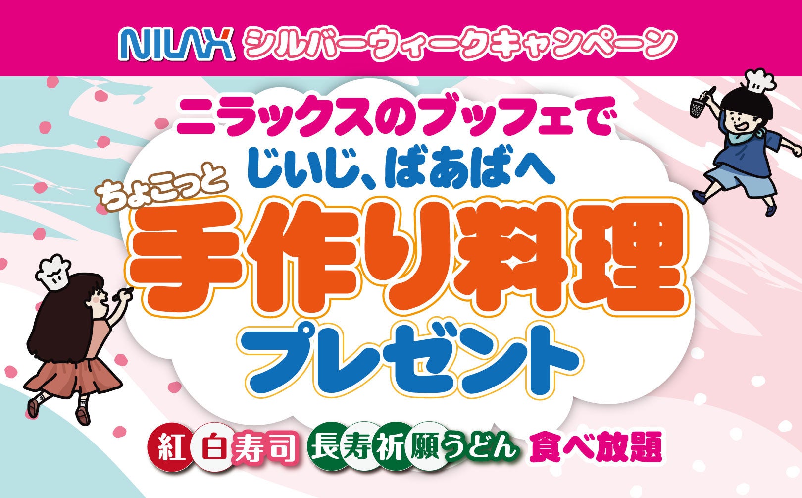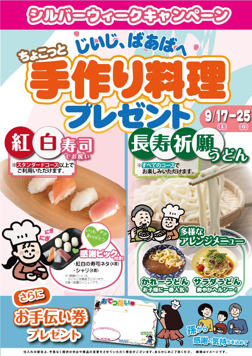 【敬老の日は食べ放題でお祝い!】3世代で楽しめる食べ放題の“ニラックスブッフェ”30店舗にて、大好きな「じいじとばあば」に『手作り料理』と、世界にひとつの『オリジナルお手伝い券』で感謝を伝えよう!