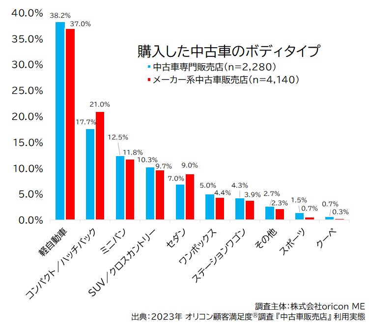 『中古車専門販売店』と『メーカー系中古車販売店』では、全体としては大きく変わらない傾向ですが、「コンパクト/ハッチバック」(差は3%)や「セダン」(差は2%)など若干の差がみられるボディタイプも見られました。