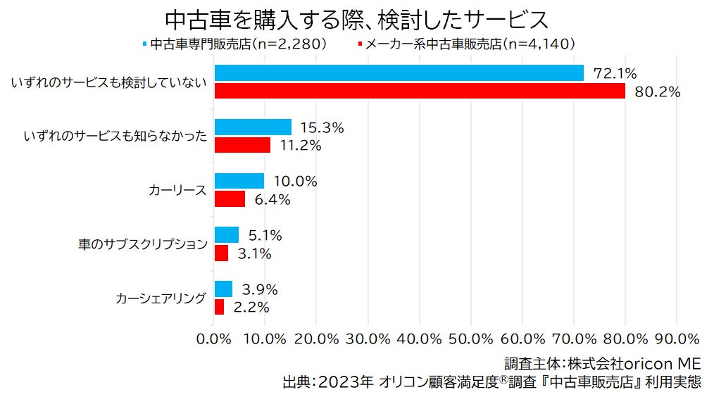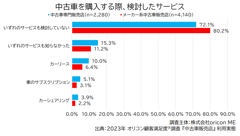 一方で、『中古車専門販売店』利用者のほうがカーシェア、サブスク、カーリースなど中古車の購入以外の検討率が高いことが読み取れます。