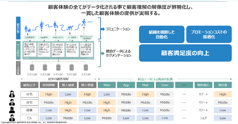 MIRARTHホールディングスグループは、お客様に寄り添い、お客様にとってより良いサービスの提供を進めていくことが当社グループのパーパスの実現には重要な事項だと考えております。そのため、お客様に対する理解度の向上に対する対応は、優先的に実施していく必要があり、グループとしての「お客様情報活用基盤」を構築することを決定いたしました。お客様情報を活用した最適なコミュニケーションの実現に向けて、当社はCDP(カスタマーデータプラットフォーム)領域におけるリーディング企業であるトレジャーデータ株式会社の「Treasure Data CDP」を活用することを決定し、その活用基盤の構築に関する豊富な知見を持たれているインキュデータ社と連携し、活用推進を目指します。