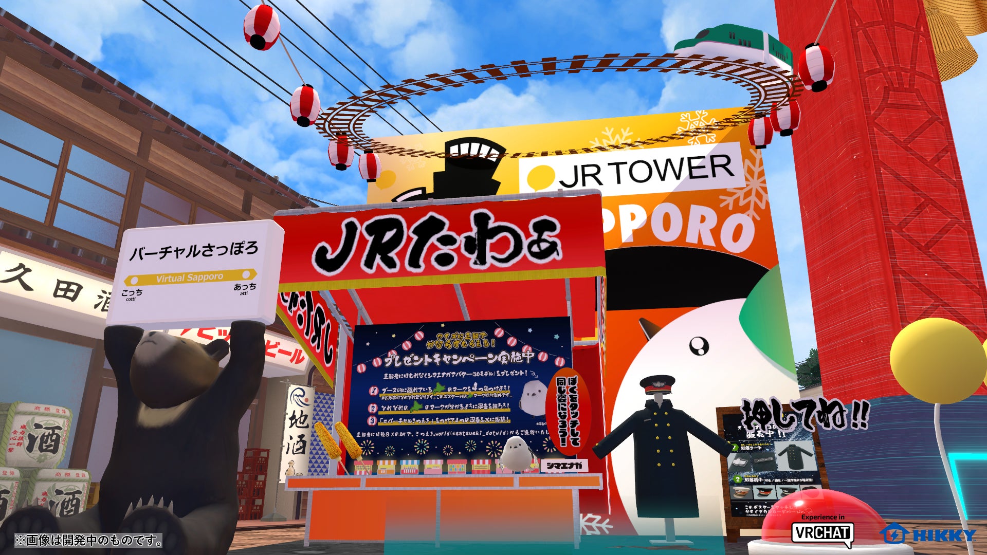 札幌駅総合開発株式会社が、前回のVketに引き続き『北海道新幹線』やメタバース空間『バーチャル札幌駅JRタワー さつえき.world』をプロモーションするブースを出展!パラリアルフジヤマに設置されるお祭り風のブース内では、前回好評だった北海道新幹線が魔法陣から出てきて宙の中のレールを突き抜けるギミックを体験できるほか、JR北海道協力のもと制作された雪国の駅員風コート等の3Dモデルを販売します。さらにブース内では日本では北海道のみに生息する鳥「シマエナガ」のアバターに着せ替えすることも可能、今回も北海道の魅力を存分に感じられるブースとなっています。