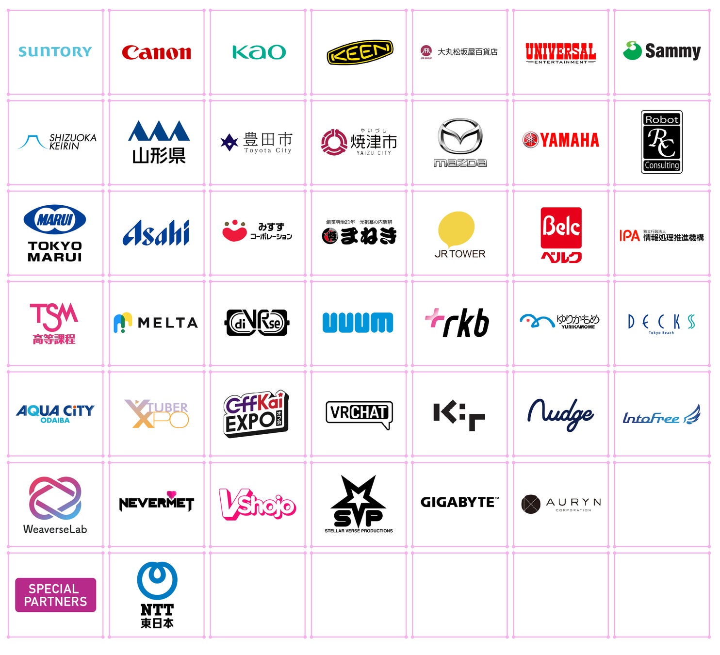 サントリー株式会社/キヤノン株式会社/花王グループカスタマーマーケティング株式会社/キーン・ジャパン合同会社/株式会社 大丸松坂屋百貨店/株式会社ユニバーサルエンターテインメント/サミー株式会社/静岡競輪場/山形県/愛知県豊田市/静岡県焼津市/マツダ株式会社/ヤマハ発動機株式会社/株式会社Robot Consulting/株式会社東京マルイ/アサヒ飲料株式会社/株式会社みすずコーポレーション/まねき食品株式会社/札幌駅総合開発株式会社/株式会社ベルク/富士フイルムビジネスイノベーション株式会社/株式会社BeBlock/独立行政法人情報処理推進機構/東京スクールオブミュージック&ダンス専門学校/株式会社メルタ/株式会社diVRse/UUUM株式会社/RKB毎日放送株式会社/株式会社ゆりかもめ/デックス東京ビーチ/アクアシティお台場/日本科学未来館/Vtuber Expo/OffKai Expo/VRChat/合同会社Kit/東日本電信電話株式会社/ナッジ株式会社/株式会社IntoFree/WeaverseLab株式会社/日本ギガバイト株式会社/株式会社アウリン