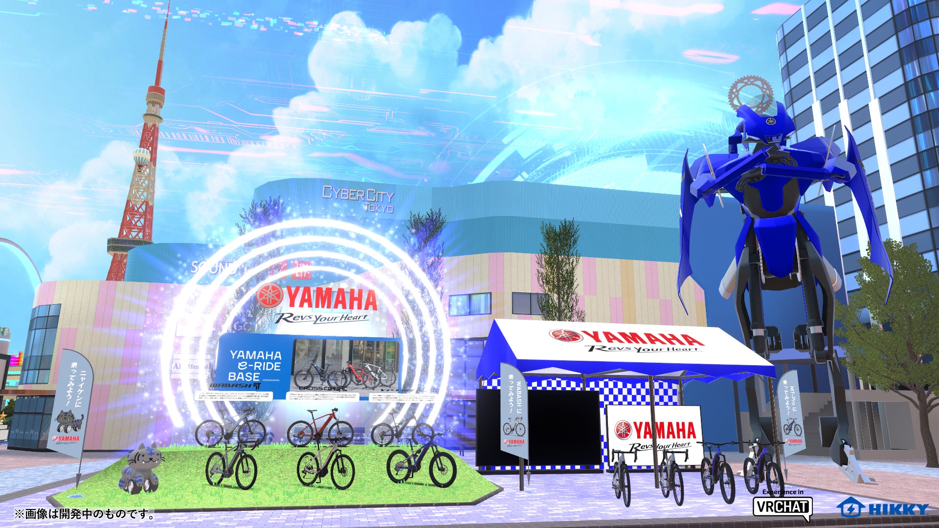 ヤマハ発動機株式会社の6度目の出展が決定!メタバースにおける乗り物の新たな価値の実証実験の場としてバーチャルマーケットを活用いただいているヤマハ発動機は、今回ヤマハ発動機初となるタイムアタックレースをメタバース上で展開します。YZF-R1がロボット化した「YXA-01」が目印の、パラリアルお台場の最終地点に出展するブースから、ヤマハ発動機のスポーツ電動自転車「WABASH」か「MT-Pro」から好きな乗り物を選んで、スタート地点まで逆走するタイムアタックレースが最大4名で楽しめます。さらにブース内にはモニターが設置され、レースを楽しんでいる人々の様子を楽しむことも可能です。