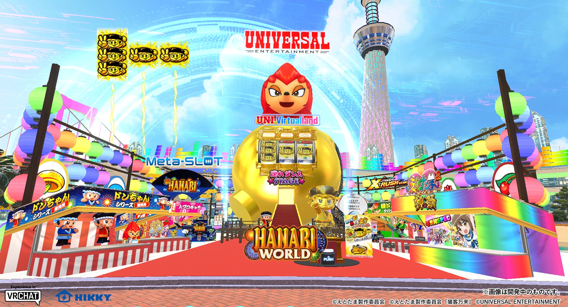株式会社ユニバーサルエンターテインメントが5回連続となる出展を決定!今回は『冬のお台場で特大花火を打ち上げよう!』をキャッチコピーに、パラリアルお台場にて同社ハナビシリーズの世界観が楽しめるブース『HANABI WORLD』を展開します。恒例の花火ギミックは「Pドラムだ!金ドン 花火外伝」をモチーフに「3連ドン!花火ギミック」と題して金ドン像の前にあるボタンを押すとブース中央の金の花火玉のリールが回転し、大当りで“3連ドン!花火”が打ち上がります。また、人気機種「緑ドン VIVA!情熱南米編」の演出をモチーフにした『エクストリームラッシュGAME』や、本格的なパチスロ体験ができるメタスロット「新ハナビ」では、集めたポイントで「緑ドンちゃん」や「葉月ちゃん」のアバターと交換することが可能です。さらに「沖ドキ!連れダンスSTAGE」 では、あなたのアバターと沖ドキ!でお馴染みの「南野カナ」「南野ハナ」に加えて、ユニバ公式Webショップ「UNI-MARKET」の見習いスタッフ「マローネ」など人気のキャラクターたちと一緒に、沖ドキ!オリジナルサウンド「EVER LASTING LOVE」に合せて踊ることができます。