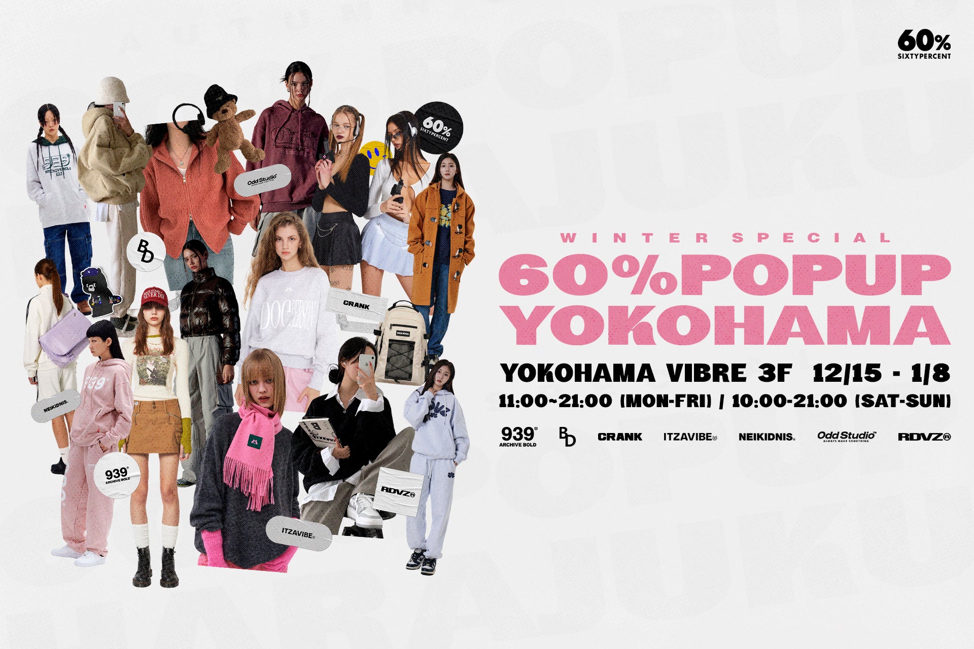 韓国・アジア各国で話題のブランドが集まるオンラインセレクトストア「60%(シックスティーパーセント)」は、2023年12月15日(金)〜2024年1月8日(月)の期間中、横浜ビブレにてポップアップストアを開催。今回のポップアップでは、韓国の人気アーティストのBLACKPINKやTWICEらがこぞって愛用する話題のブランド「ITZAVIBE」(イッザバイブ)やY2Kブームを牽引する「CRANK」(クランク)など述べ7ブランドが最新秋冬商品を販売。日本初上陸となるブランドも数多くあり、日本ではなかなか手に取ることができないアジア・韓国ブランドを実際に試すことができる空間となっている。