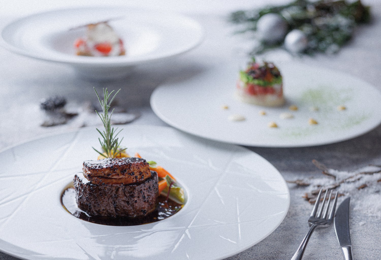クリスマスを彩る食前の一皿は星の煌きのようなキャビアを贅沢に使用しオマール海老やフォアグラ、黒毛和牛フィレ肉をトリュフ薫る濃厚なソースで仕上げた逸品などをお楽しみいただける極上のコースをご提供いたします。