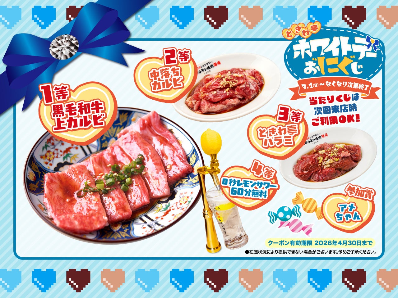 この度、ホワイトデーに合わせた企画として、人気メニューが当たるくじ引きキャンペーン『ホワイトデーお“にく”じ』を開催します。3月1日(日)より期間限定で、対象店舗にてお会計5,000円(税込)ごとにくじ引きに挑戦でき、次回以降の来店時に利用できるお得なクーポンが当たります。クーポンは、「黒毛和牛上カルビ」や「中落ちカルビ」、「ときわ亭ハラミ」など人気焼肉メニューの他、「0秒レモンサワー®」60分飲み放題無料などをご用意しています。