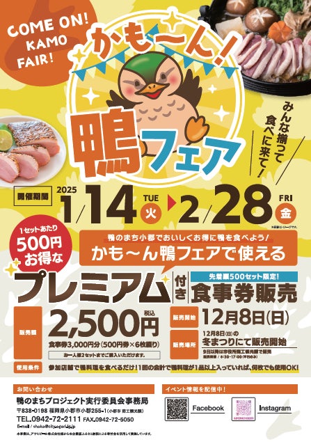 1月から小郡市で使用できる「プレミアム率20%の鴨グルメ券」販売会