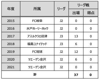 J2リーグ 18試合(0得点) / J3リーグ 19試合(0得点)
