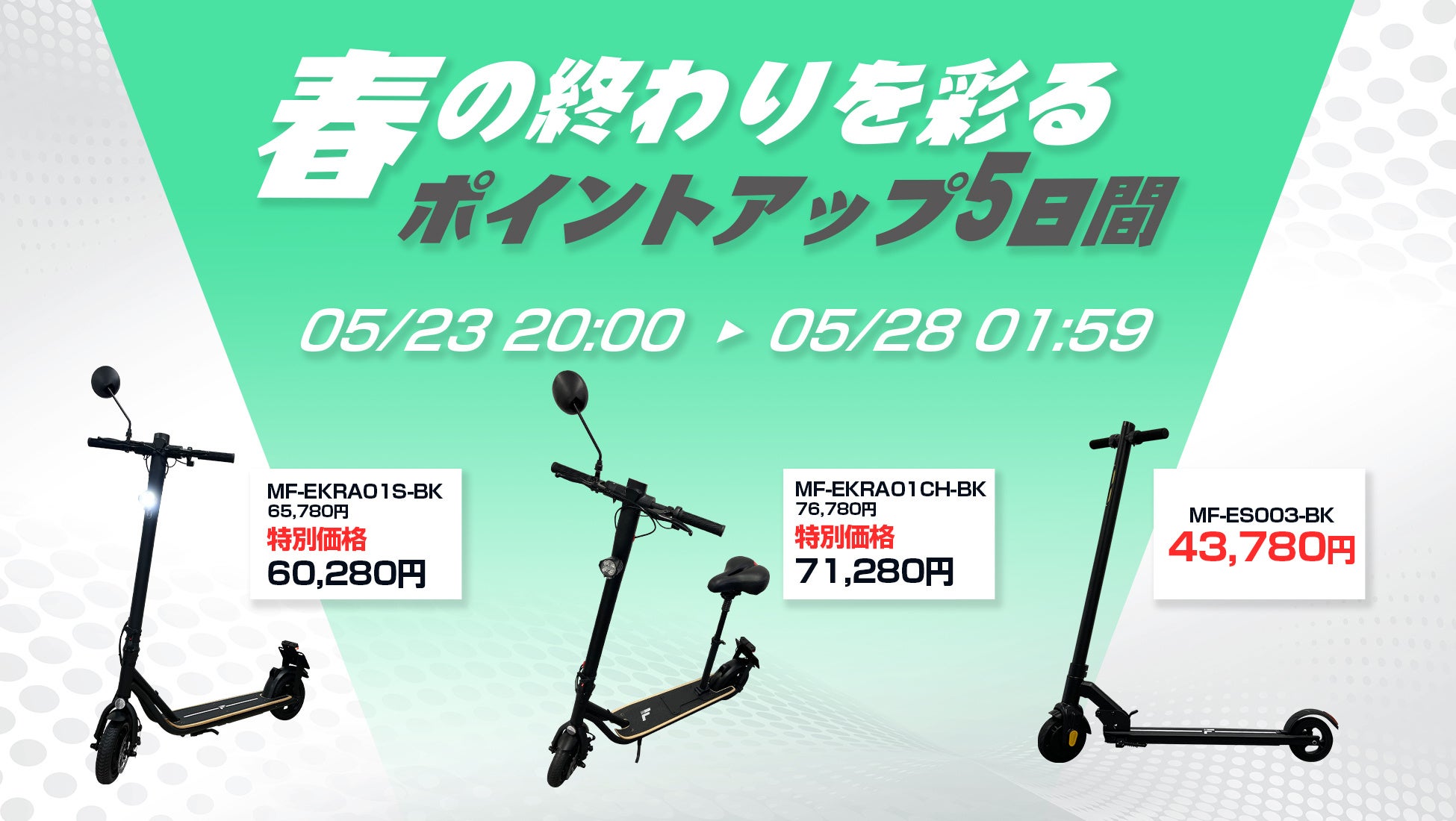 楽天「Show !t」レジャーにおすすめ、公道走行対応電動キックボードの5,000円オフセールを開催。さらに5月23日(火)20時スタート全商品ポイント10倍、楽天お買い物マラソンに参加。