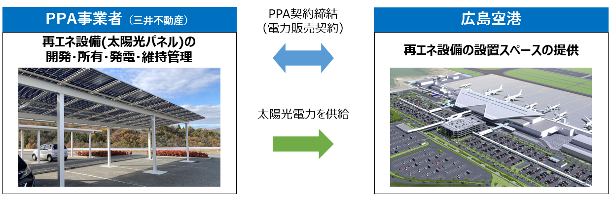 また、広島国際空港株式会社の筆頭株主である三井不動産株式会社は、自社が持つ知見を最大限活用し、広島国際空港株式会社と一体となって、広島空港の脱炭素化推進について検討を進め、その結果、脱炭素化に向けた取り組みの第一弾として、PPAスキームを活用した再生可能エネルギーの導入を行うこととなりました。
