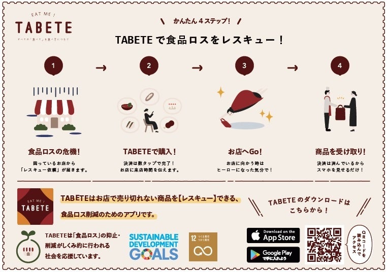 ※「TABETE」では、食品の購入を「レスキュー」にたとえ、お店が出品することを「レスキュー依頼」、食品を購入するユーザーを「レスキュー隊員」と表しています。