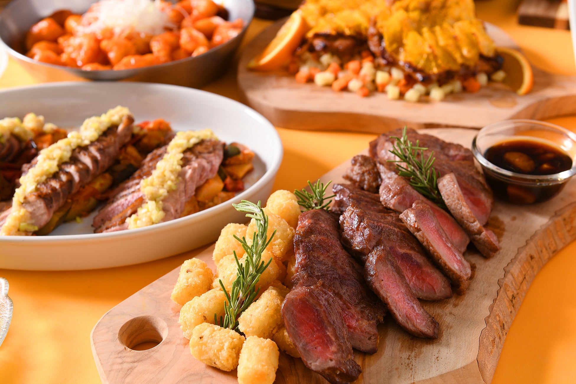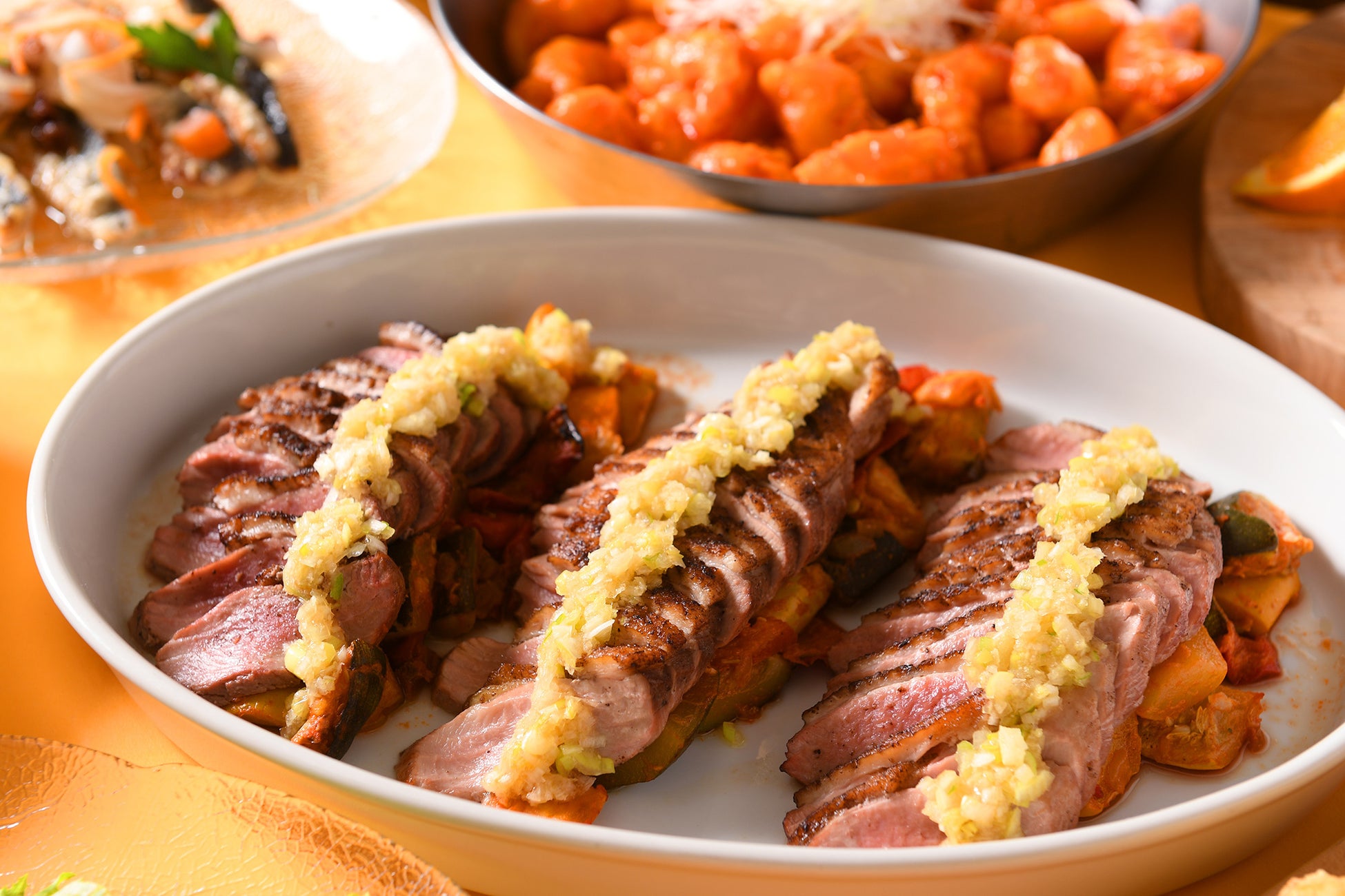 さらに、香ばしく焼き上げたビーフステーキや鴨胸肉ローストなど、冬の食卓を華やかに彩る肉料理がずらりと並びます。