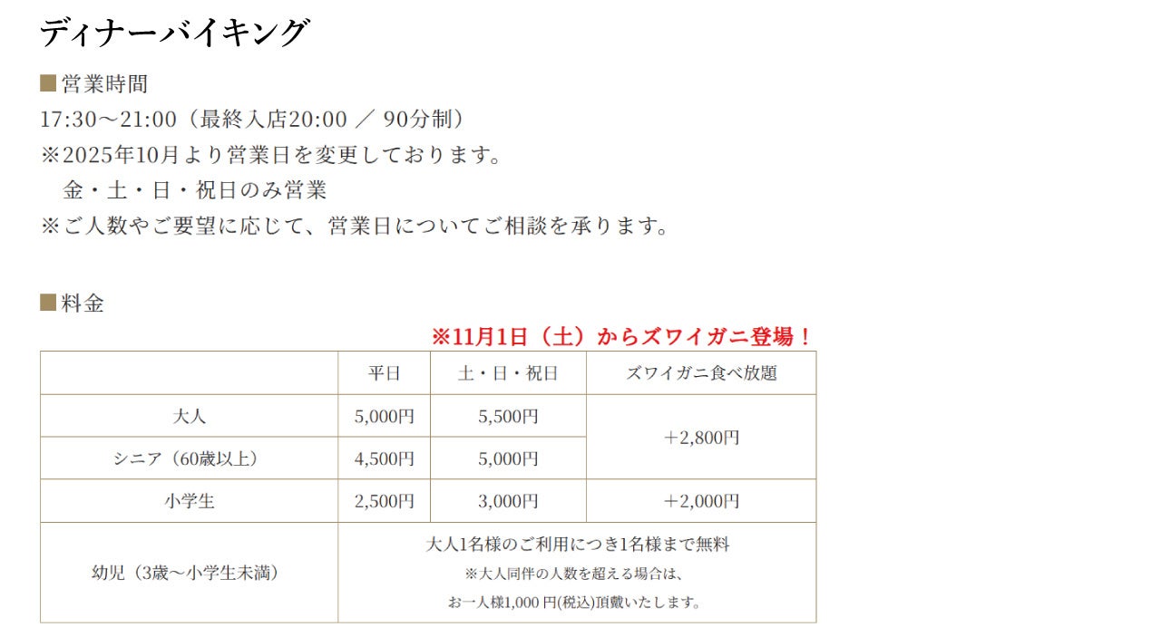 ディナー限定の "カニタワー" によるズワイガニ食べ放題、シェフが目の前で揚げる "ライブ天ぷら"、思わず写真を撮りたくなる "雪崩れるいちごのショートケーキ" など、魅力的なメニューが勢ぞろい。