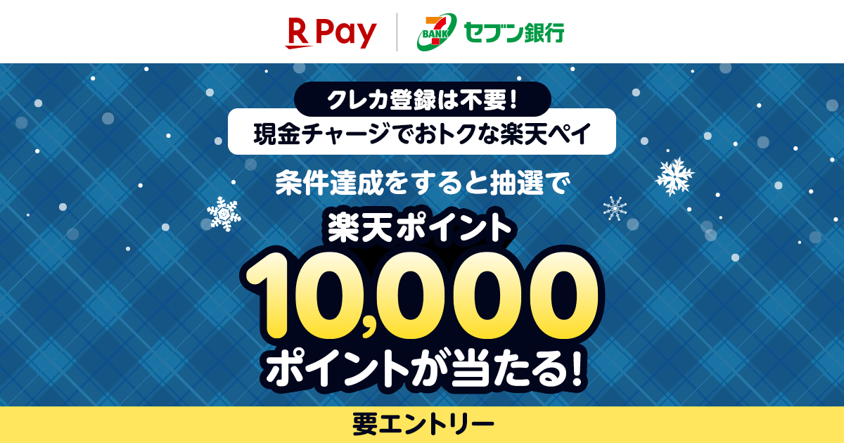 参加条件 | 以下の条件を全て満たした方がキャンペーンの対象となります。 1. キャンペーン期間中にエントリーを完了した方 2. キャンペーン期間中にセブン銀行ATMで「楽天ペイ」アプリを通じて「楽天キャッシュ」へ1,000円以上チャージをした方 ※エントリー・チャージの順序は問いません。 |