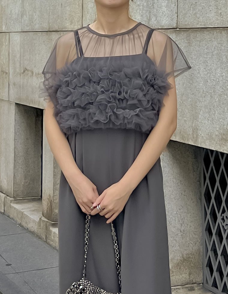 シアー感のあるチュール素材が大人フェミニンな魅力を演出するオールインワン