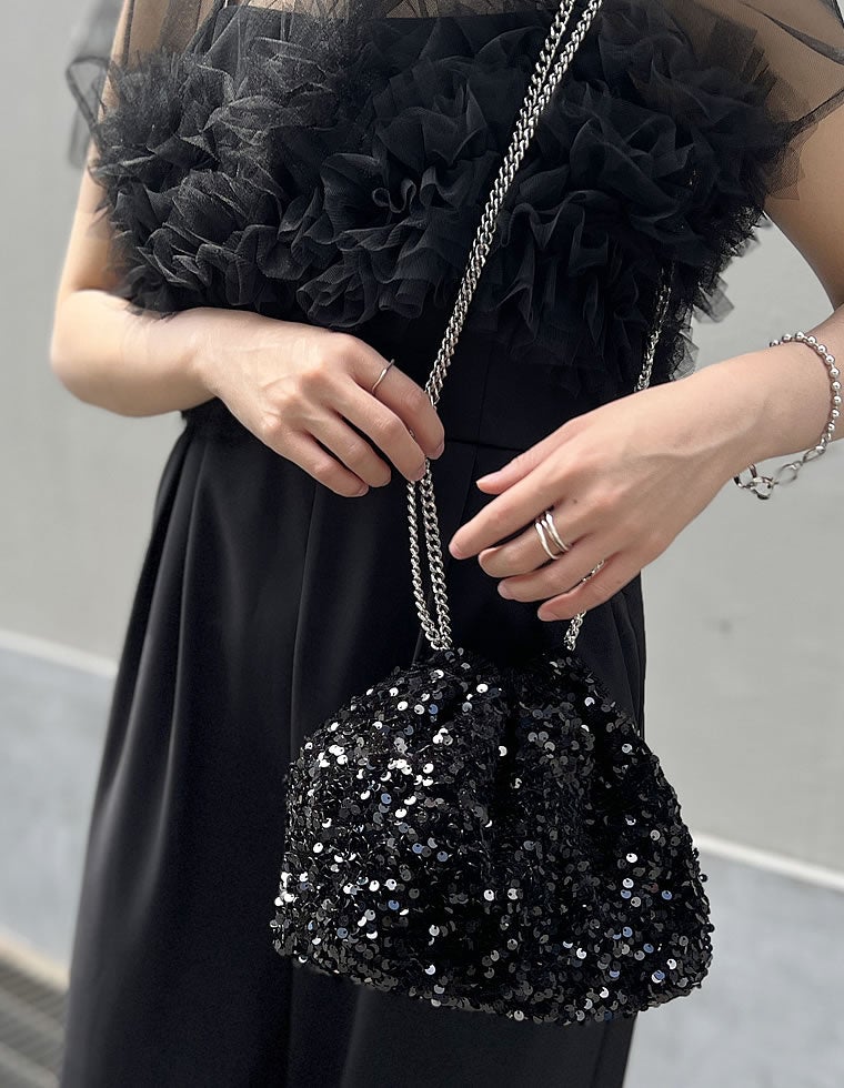 ベロアのリッチな質感と、スパンコールのキラキラした輝きが、シンプルな装いにもアクセントをプラスします。