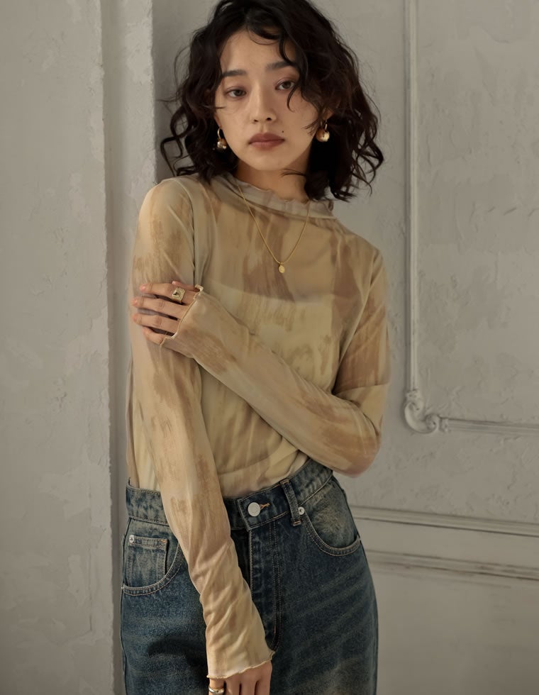 透け感のある軽やかなシアー素材にマーブルプリントが新鮮なトップス