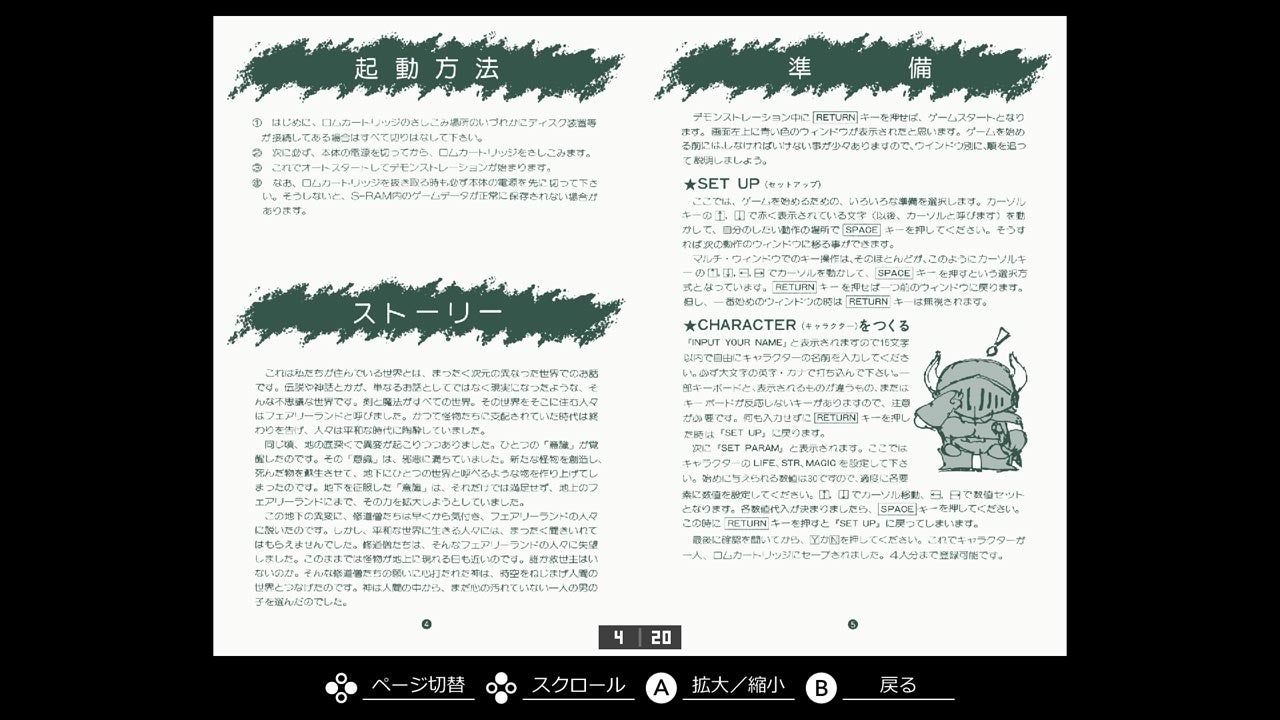 当時「アクティブRPG」と称された本作は、アクション性が肝(キモ)。プレイヤーは攻撃と防御のモードを切り替えながら、モンスターに体当たりで戦います。モンスターを倒せば経験値が手に入り、レベルアップしてより強くなっていきます。傷ついたときは、平地などで休ませることで自動的に体力が回復するようになっています。