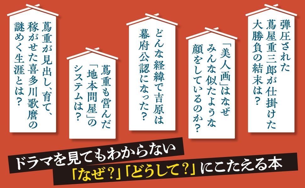 歴史は、舞台裏がおもしろい! 弾圧された蔦屋重三郎が仕掛けた「大勝負」の結末は? 蔦重が見出し、育て、稼がせた喜多川歌麿の謎とは? 幕府公認の郭町・吉原って、そもそもどんなところ? ほか、浮世絵、出版事情、吉原から、芝居、グルメ、ファッションまで……。