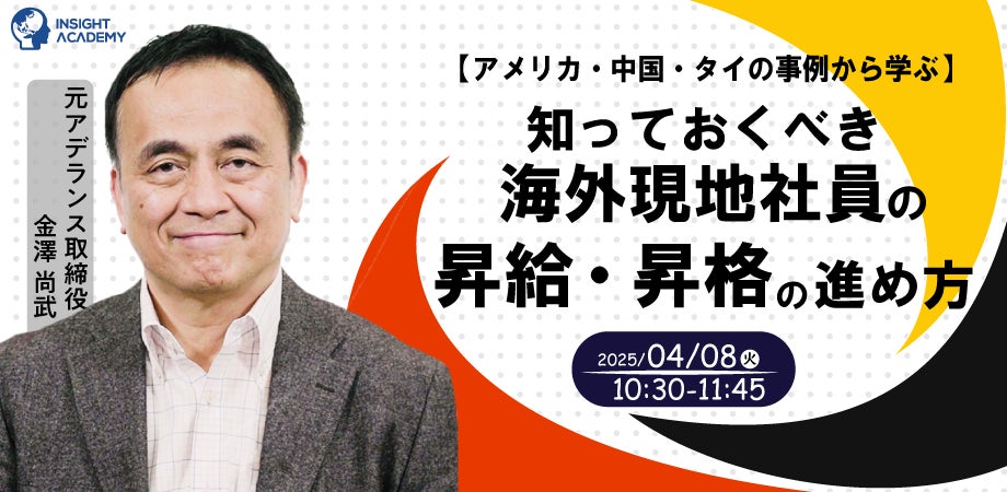 グローバル⼈材育成・研修業を⼿掛けるインサイトアカデミー株式会社(本社:東京都港区新橋、代表:金 珍燮)は、無料webセミナー「【アメリカ・中国・タイの事例から学ぶ】知っておくべき海外現地社員の昇給・昇格の進め方《無料アーカイブ動画生配信》」を2025年4月8日(火)10:30より開催します。