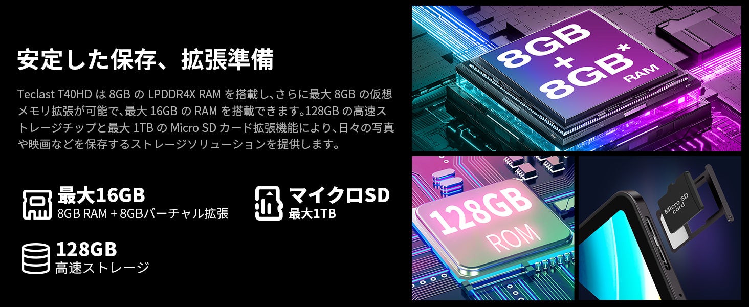 8GBのLPDDR4X RAMを搭載し、さらに最大8GBの仮想メモリ拡張が可能で、最大16GBのRAMを搭載できます。128GBの高速ストレージチップと最大1TBのMicro SDカード拡張機能により、日々の写真や映画などを保存するストレージソリューションを提供します。スレンダーフレームに収めら、堅牢な7200 mAhポリマーリチウム電池で長時間使用を確保します。多機能Type-Cポートと組み合わせて、充電が高速かつスムーズに行えます。