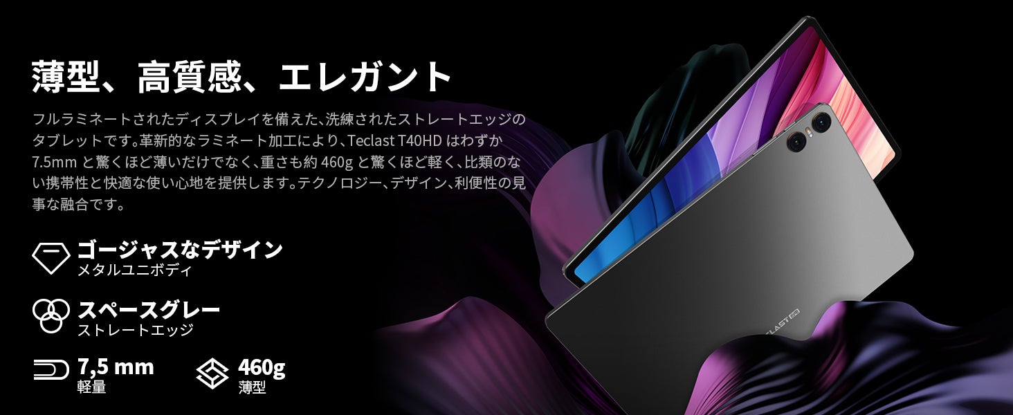 フルラミネートされたディスプレイを備えた、洗練されたストレートエッジのタブレットです。革新的なラミネート加工により、Teclast T40HDはわずか7.5mmと驚くほど薄いだけでなく、重さも約460gと驚くほど軽く、比類のない携帯性と快適な使い心地を提供します。内蔵のスマートセンサーと互換性があり、カバーの開閉により、画面が自動的にスリープ設定または解除になります。