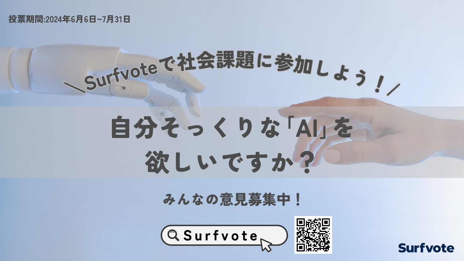 近年、ChatGPTなどの生成AIが普及し、多くの人々がAIの名前を耳にするようになりました。博報堂生活総合研究所の調査によれば、「AIを信じる」と答えた人は53.6%で、特に若い世代でその割合が高いです。AI技術の進化に伴い、将来、自分にそっくりなAIが登場するかもしれません。こうした「自分AI」は、精神的なサポートや物理的なタスク代行に役立つ反面、自己肯定感への影響や自分の嫌な側面を再認識するリスクもあります。AIとの共存について、Surfvoteでひろく意見を集めます。https://surfvote.com/issues/ry44h1n1a8ds
