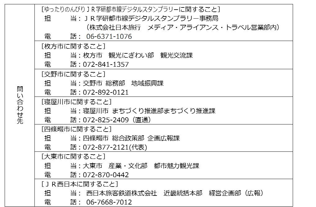 枚方市、交野市、寝屋川市、四條畷市、大東市、および西日本旅客鉄道株式会社(以下「JR西日本」)は、JR学研都市線沿線5市の様々なスポットを巡るスタンプラリーを、JR西日本が提供する移動生活ナビアプリ「WESTER」にて実施します。本スタンプラリーは、株式会社ギックスが提供する個客選択型スタンプラリー「マイグル」を活用したデジタルスタンプラリーです。JR学研都市線の駅を利用して5市それぞれのおすすめスポットを巡っていただくと、巡った市の数に応じて抽選で沿線5市のゆかりの品等が当たります。