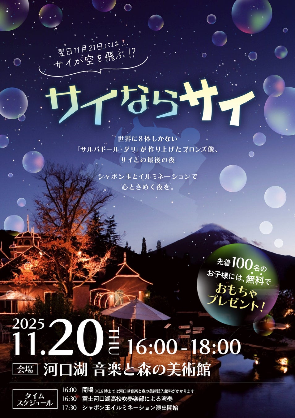 その前夜、11月20日(木)に開催される「サイならサイ」は、芸術と地域の絆を象徴する送別イベント。富士河口湖高校吹奏楽部による演奏、幻想的なシャボン玉イルミネーション、そして地域の子どもたちに贈られる“光るおもちゃ”など、すべてが「つながり」をテーマに構成されています。
