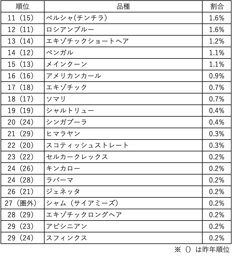 11位〜30位のランキングでは、「ペルシャ(チンチラ)」が昨年15位から11位に、「エキゾチックショートヘア」が14位から13位にランクアップし、短頭種の猫ちゃんが人気になってきているようです。