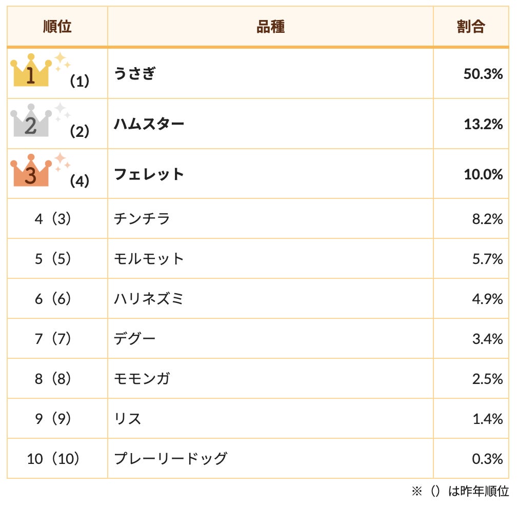 昨年に引き続き「うさぎ」が1位に輝きました。その愛らしい姿と親しみやすい性格が多くの飼い主たちを魅了しています。続いて「ハムスター」が2位との結果になりました。「フェレット」が昨年の4位から3位にランクアップしています。