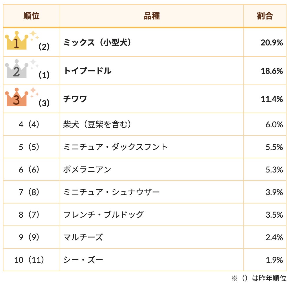 個性豊かな魅力の「ミックス(小型犬)」が1位に輝きました。「ミックス(小型犬)」は昨年2位からランクアップで1位獲得になります。昨年1位だった「トイプードル」は2位にランクダウンし、3位〜6位については昨年と同様の結果になりました。