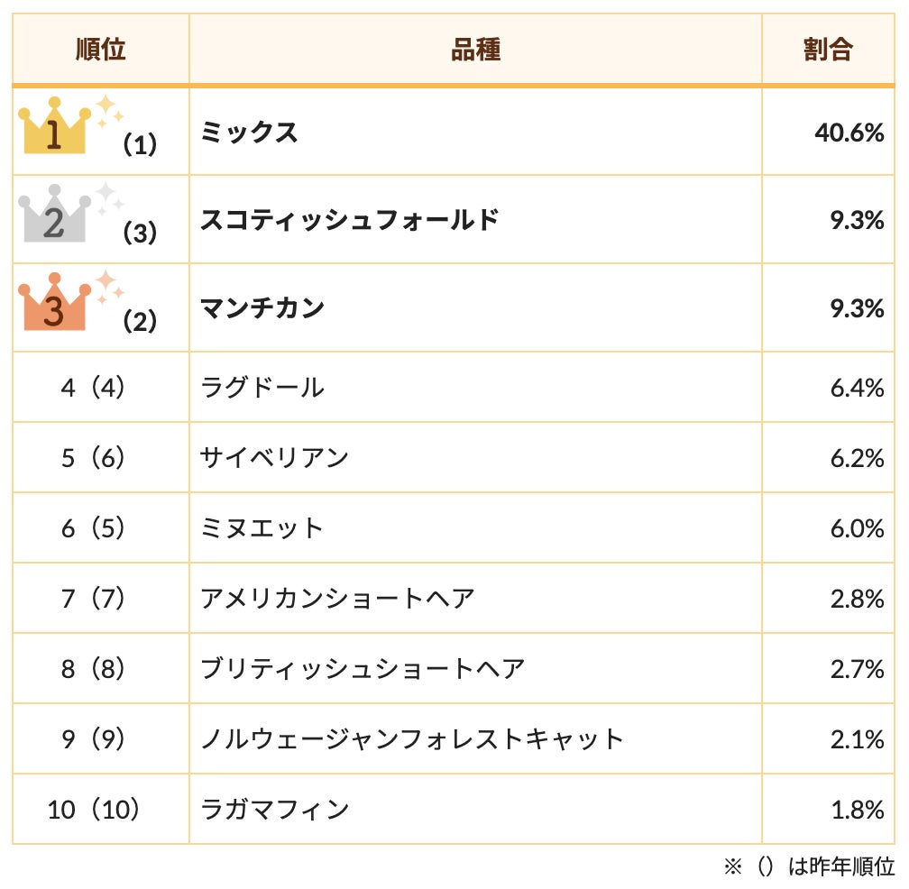 今年も「ミックス(混血種)」が1位となり、個性豊かで魅力的な外見が多くの人々の心を掴んでいます。僅差ではありましたが、昨年3位だった「スコティッシュフォールド」が2位にランクアップし、「マンチカン」が3位との結果になりました。